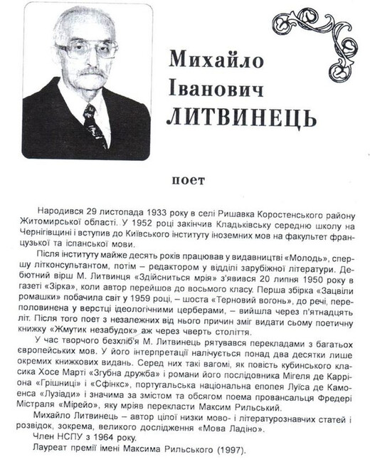 Отже, до вашої уваги – оповідь поета, перекладача, вихідця із Кладьківки Михайла Литвинця «Поліський говір придесенської Кладьківки». Наразі Михайло Іванович проживає у Києві. Записав краєзнавець із Кладьківки Анатолій Чумаченко (рік запису – 2025).