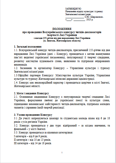 З нагоди 155-річчя від дня народження Лесі Українки запрошуємо до участі у Всеукраїнському конкурсі читців-декламаторів, який відбудеться 18 лютого 2026 року у місті Звягель за адресою: